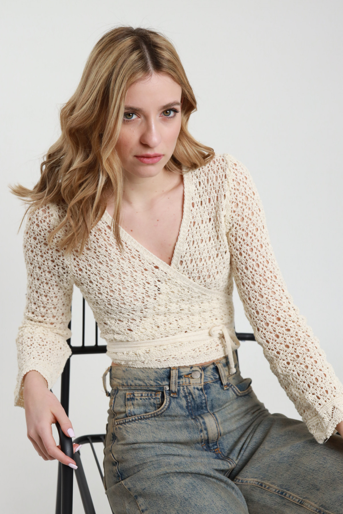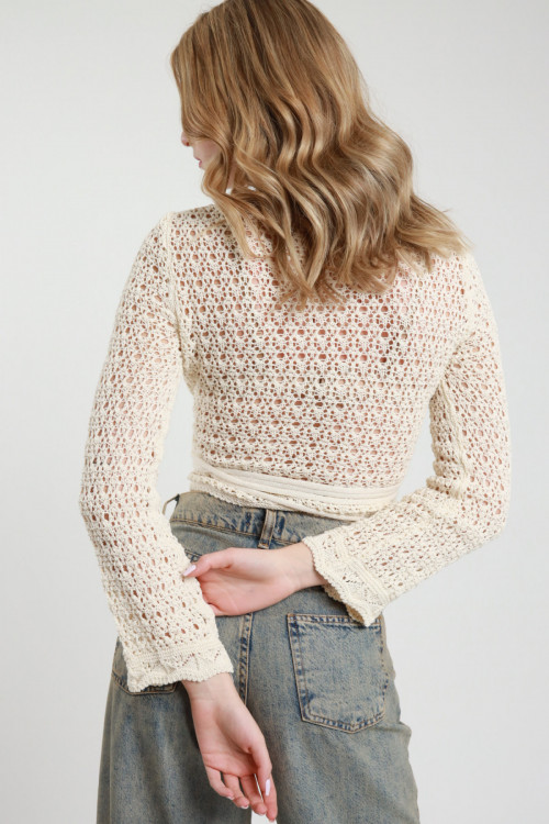 Cardigan Crop Incrociato in Maglia Traforata con Chiusura Lacci.