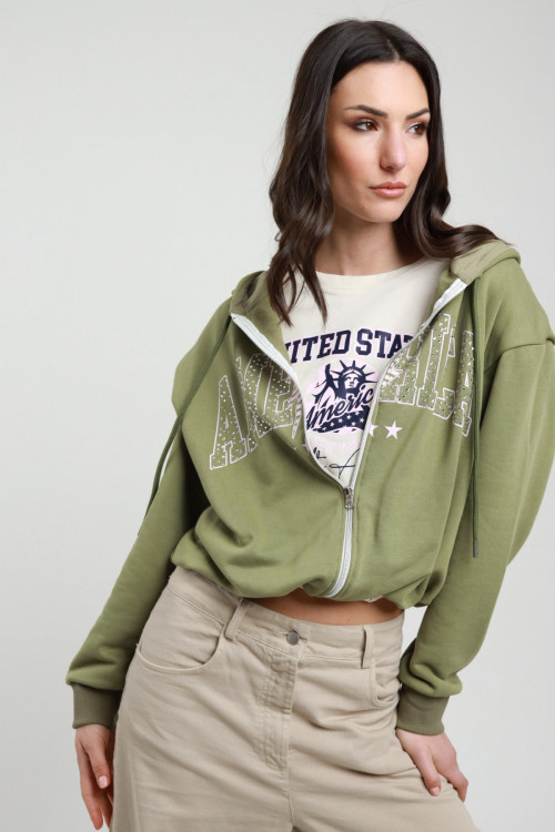 Felpa con Cappuccio con Stampa e Strass sul Fronte + T-shirt Cucita con Stampa.