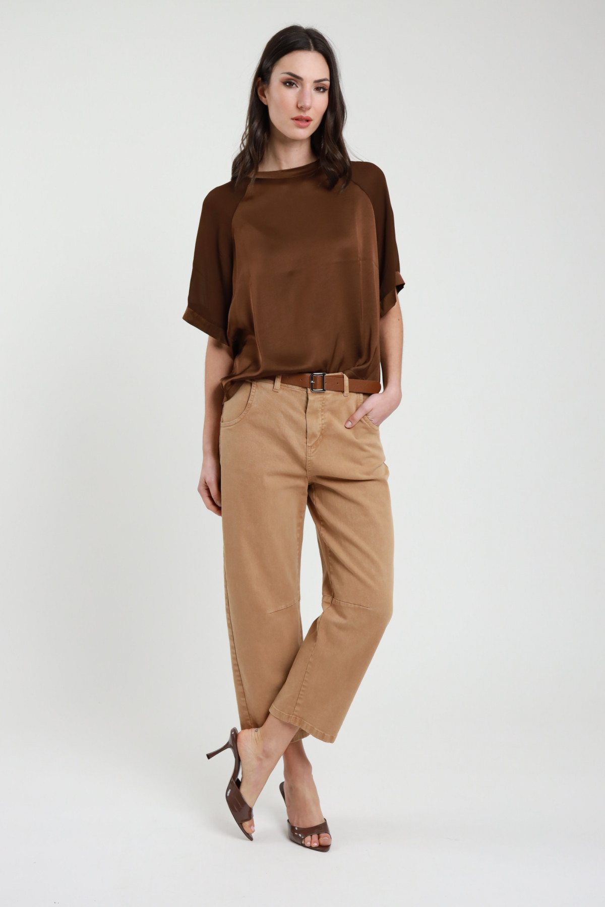 Hose mit hoher Taille, weicher Linie, weitem, an den Knöcheln schmal zulaufendem Bein, Seitentaschen, glänzendem Stoff. 58%vi 31%ny 11%pl