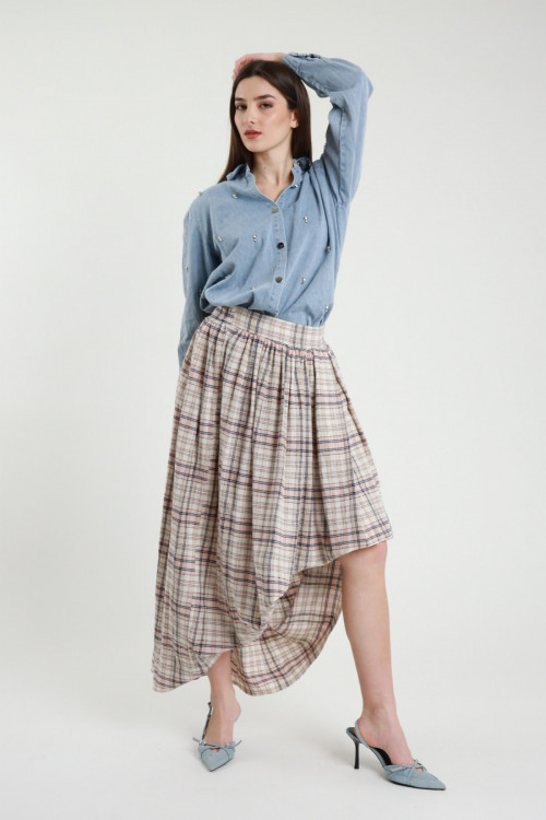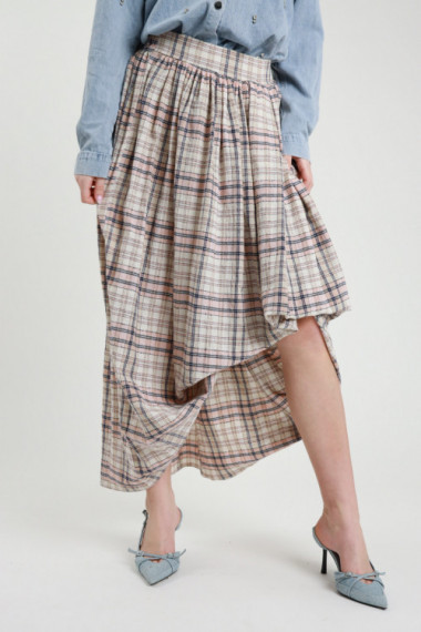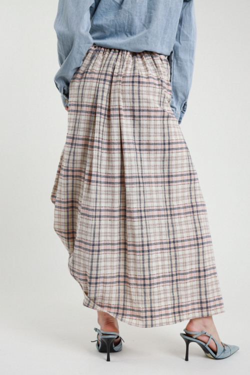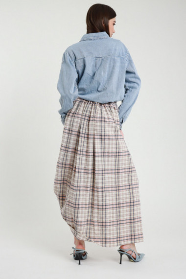 Gonna Lunga a Quadri con Elastico in Vita con Lunghezza Regolabile con Bottone.