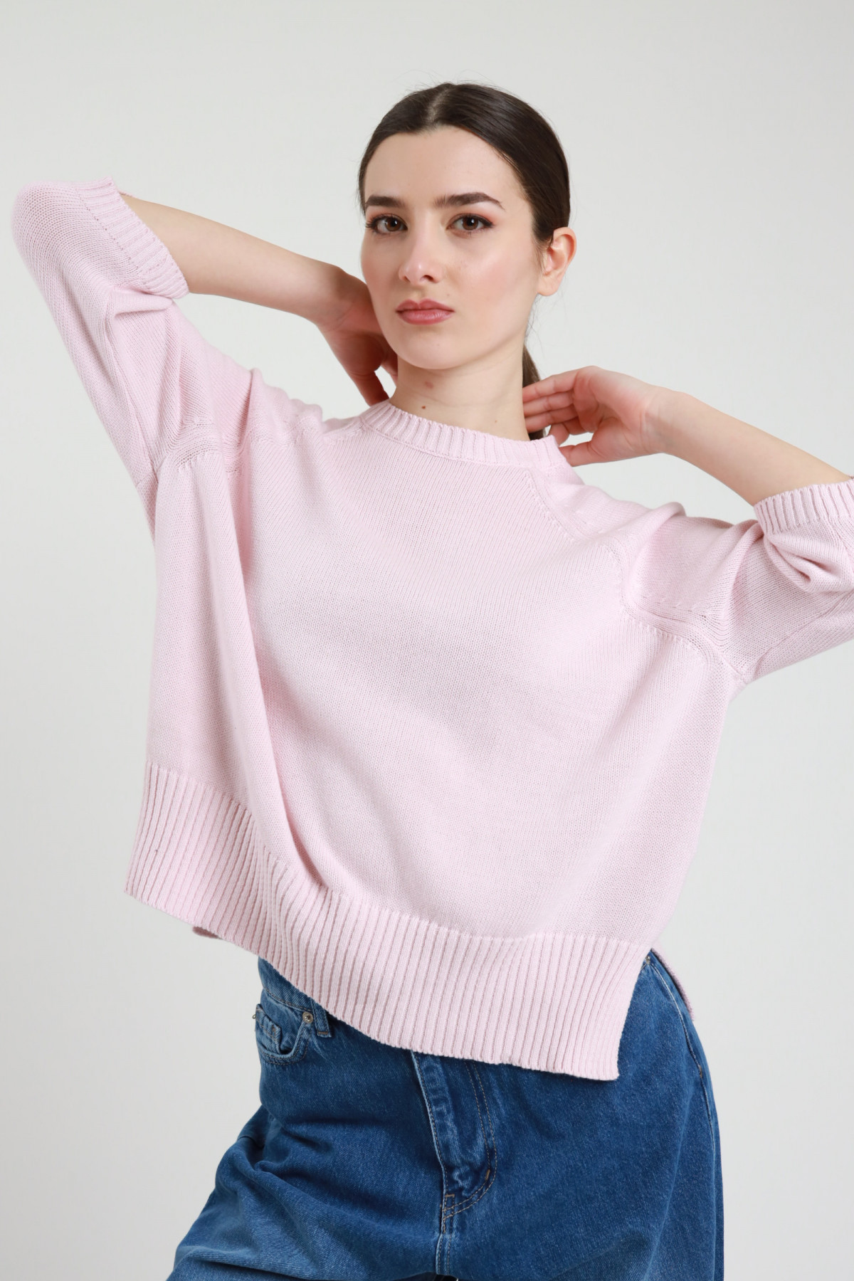 Maglia in Cotone Paricollo Raglan con Maniche 3/4 e Spacchi Laterali sul Fondo.