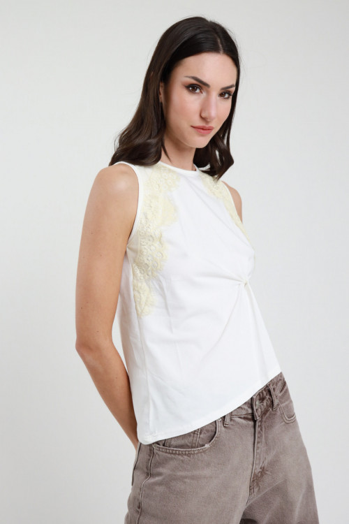 Top Crop Smanicato Asimmetrico con Ripresa sotto il Seno e Pizzo Applicato sul Giromanica.