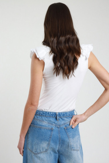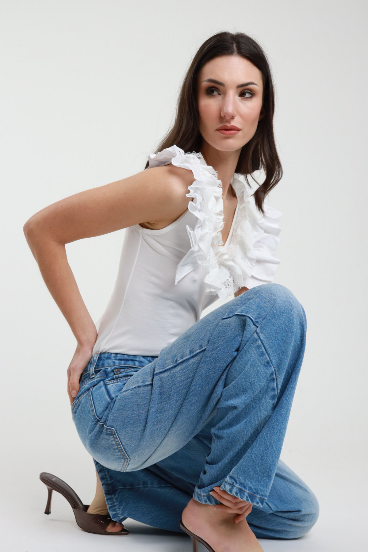 Top Smanicato in Cotone Elasticizzato con Scollo a V con Gale e Pizzo.