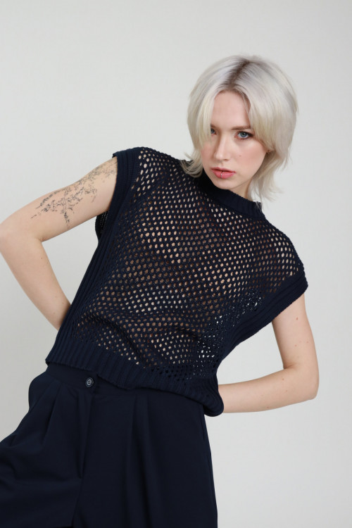 Gilet Girocollo in Maglia di Cotone Traforata con Bordi a Coste.