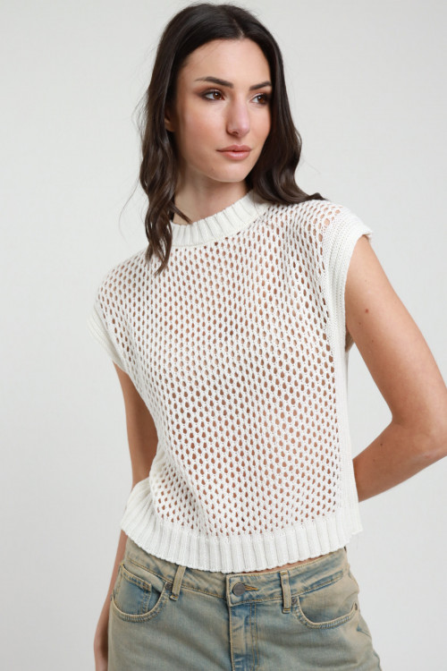 Gilet Girocollo in Maglia di Cotone Traforata con Bordi a Coste.