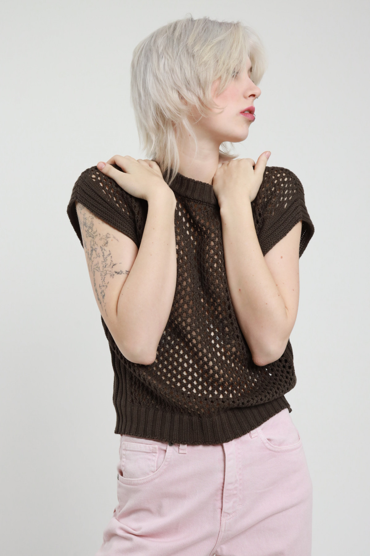 Gilet Girocollo in Maglia di Cotone Traforata con Bordi a Coste.
