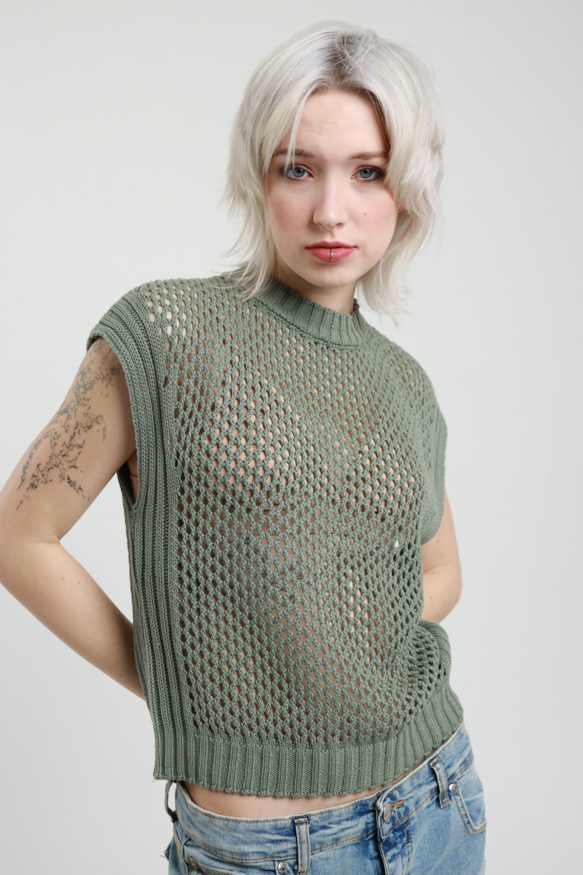 Gilet Girocollo in Maglia di Cotone Traforata con Bordi a Coste.