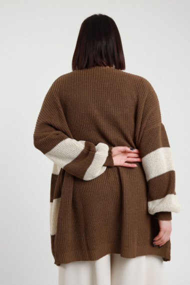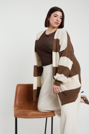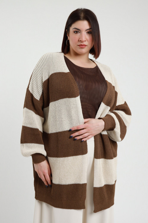 Cardigan Lungo Aperto a Righe Larghe sul Fronte e sulle Maniche, Tinta Unita sul Retro - Linea Curvy Susy Star.