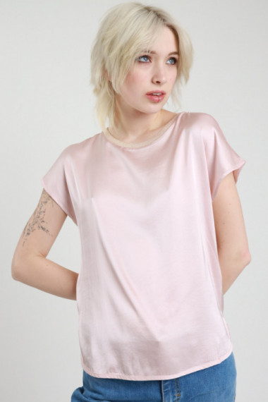 Blusa in Viscosa Elasticizzata Effetto Raso, Girocollo con Lurex e Mezze Maniche.