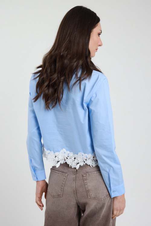 Camicia Crop in Cotone, Modello a Scatola con Pizzo Crochet sul Fondo.