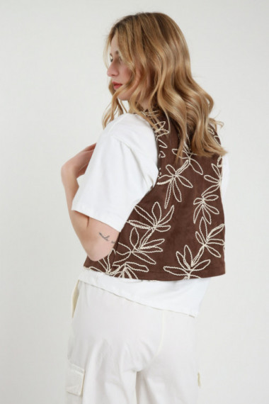 T-Shirt Mezze Maniche in Cotone con Gilet in Ecodainetto con Ricami Floreali e Chiusura Lacci.
