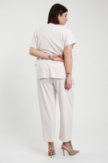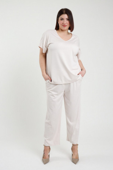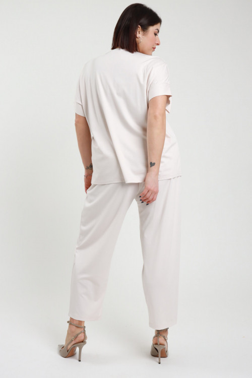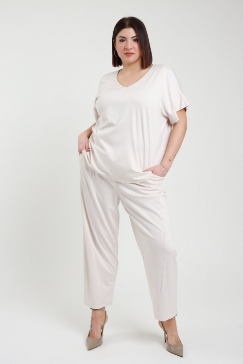 Completo con Blusa a Maniche Corte e Scollo a V, Pantaloni ad Ovetto con Tasche a Portafoglio, Elastico in Vita e Cucitura Asimettrica - Linea Curvy Susy Star.