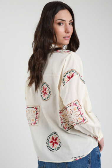Camicia Collo alla Coreana con Ricami su Fronte e Retro, Chiusura Maniche con Bottoncino.