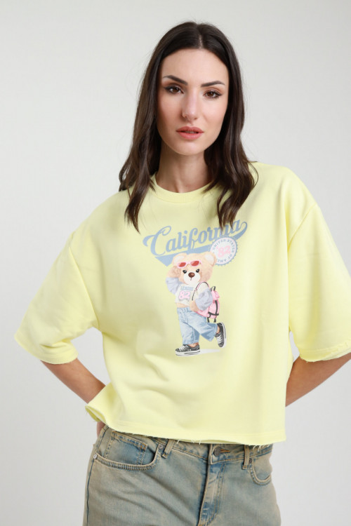 Felpa Girocollo Taglio Quadrato Con Maniche Over A 3/4 Con Fondo Leggermente Sfrangiato. Stampa Sul Fronte Con Orsetto e Scritta "California". 65%co 35%pl