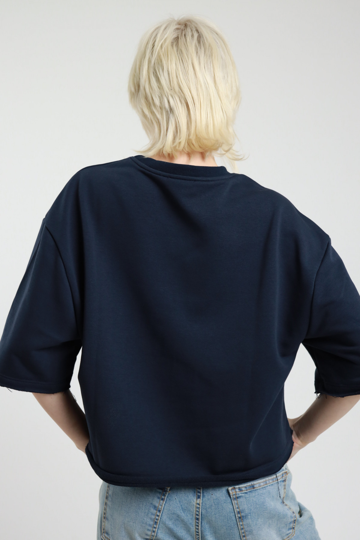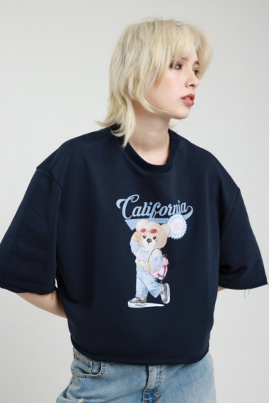 Felpa Girocollo Taglio Quadrato Con Maniche Over A 3/4 Con Fondo Leggermente Sfrangiato. Stampa Sul Fronte Con Orsetto e Scritta "California". 65%co 35%pl