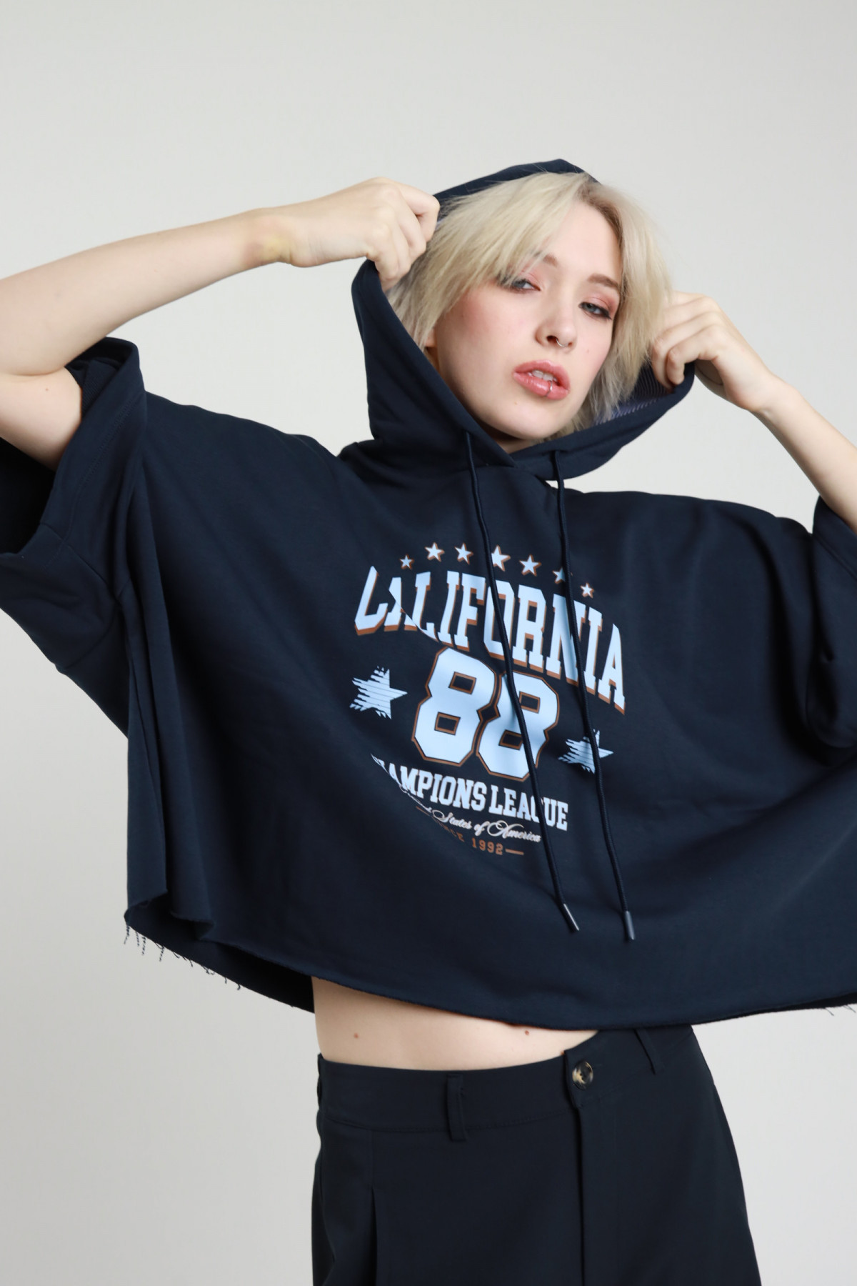 Felpa Over Crop con Cappuccio, Maniche 3/4 e Stampa ''California'' sul Fronte.
