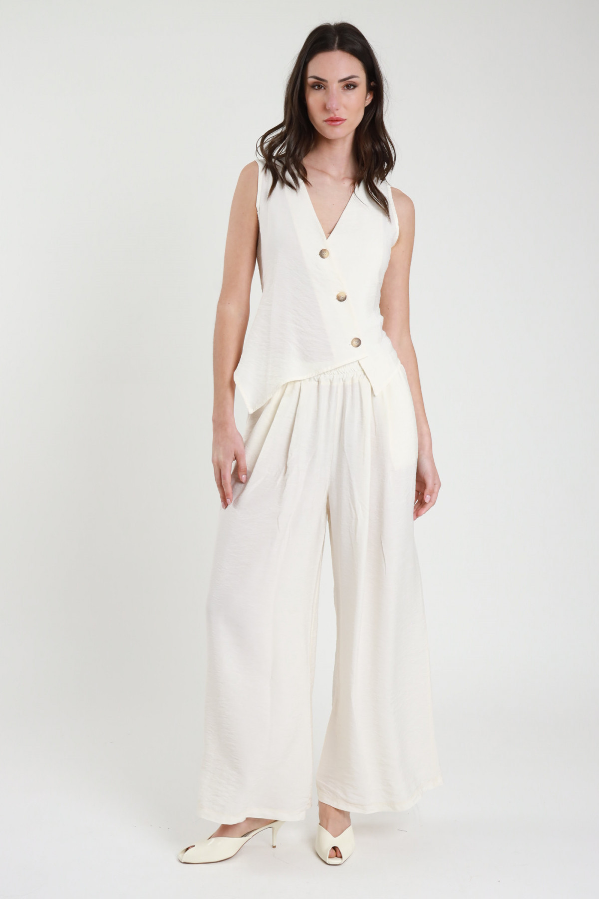 Gilet Svasato con Chiusura Bottoni Diagonali, Laccio Regolabile sul Retro.