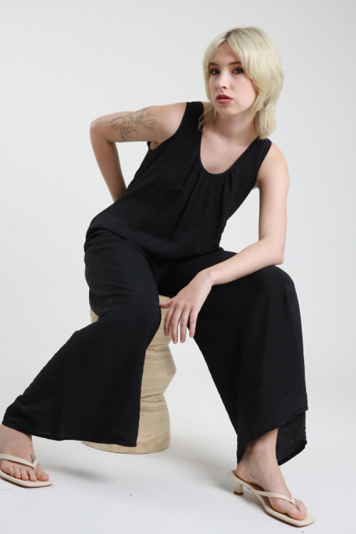 Tuta Smanicata con Arriccio sullo Scollo, Pantalone Ampio con Tasche Laterali e Cut-Out sul Retro con Chiusura Fiocco.