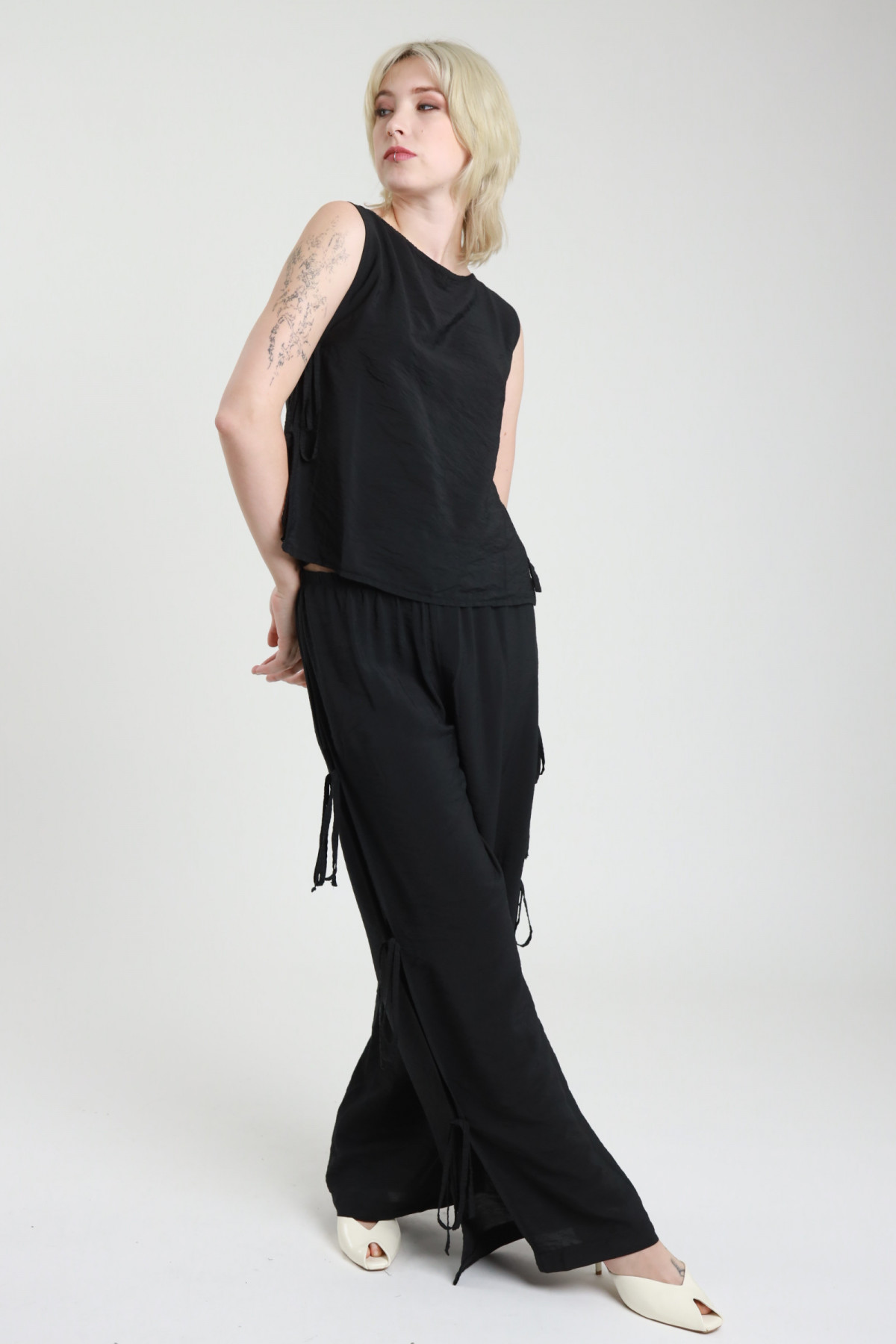 Pantaloni Gamba Dritta con Elastico in Vita, Cut-Out e Chiusura Fiocchetti Laterali.