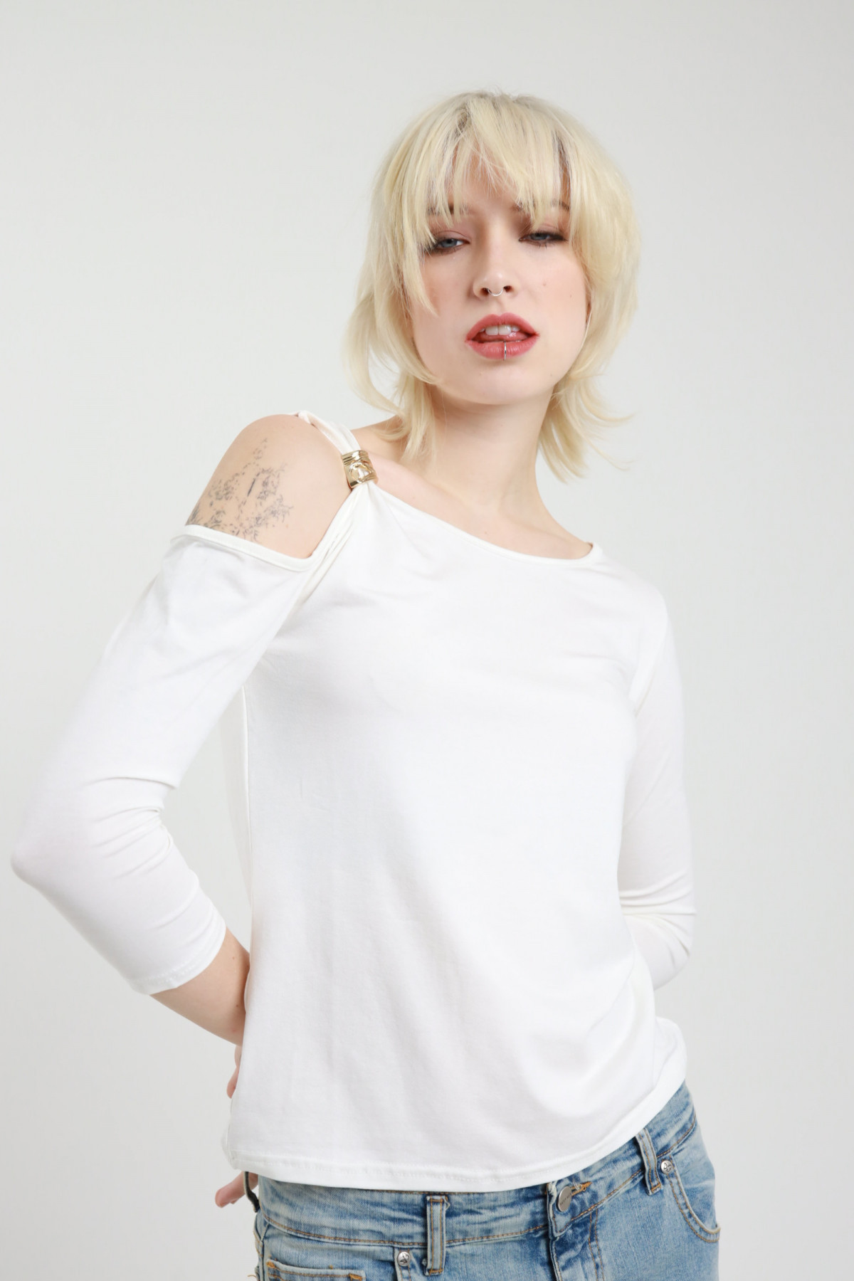Maglia in Viscosa Elasticizzata con Maniche 3/4 e Cut-Out sulla Spalla con Accessorio Dorato.