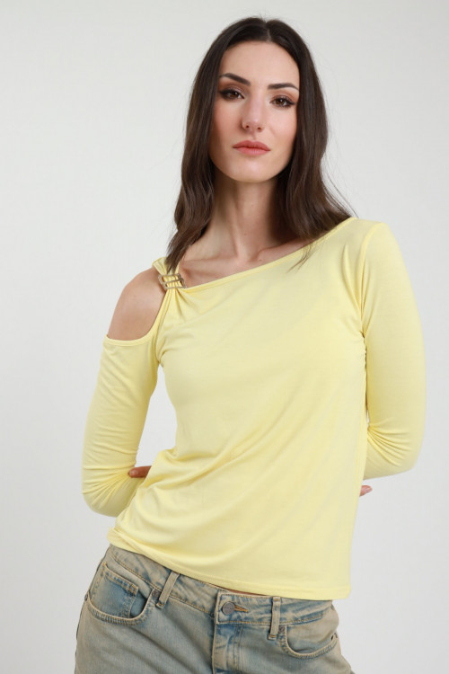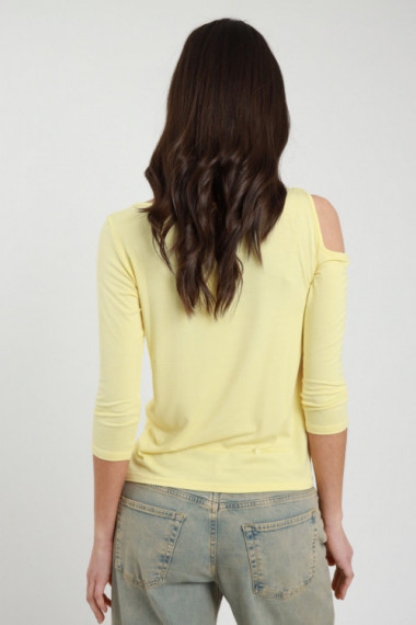 Maglia in Viscosa Elasticizzata con Maniche 3/4 e Cut-Out sulla Spalla con Accessorio Dorato.
