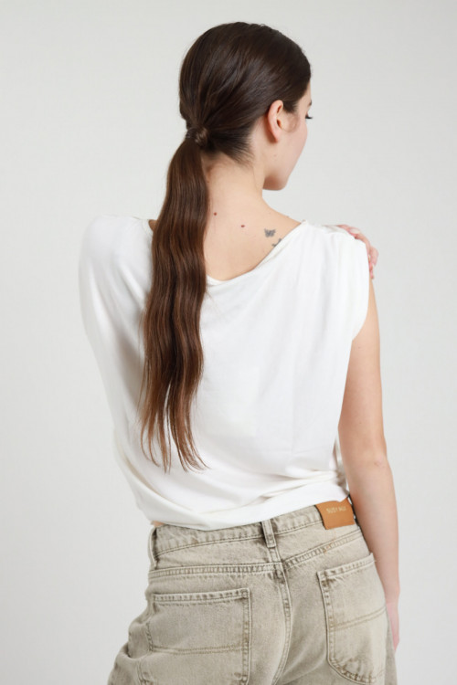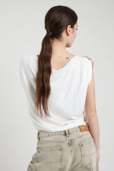 T-Shirt Asimmetrica in Viscosa Elasticizzata con Accessorio Dorato sulla Spalla.