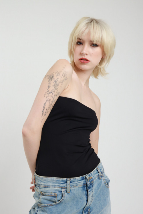 Asymmetrisches, ärmelloses Crop-Top mit Raffung unter der Brust und Spitze am Armloch. 94 % CO 6 % Stück
