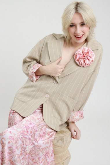 Giacca Over Gessata con Spilla Fiore Rimovibile in Fantasia Cashmere Abbinata alla Fodera Intera.