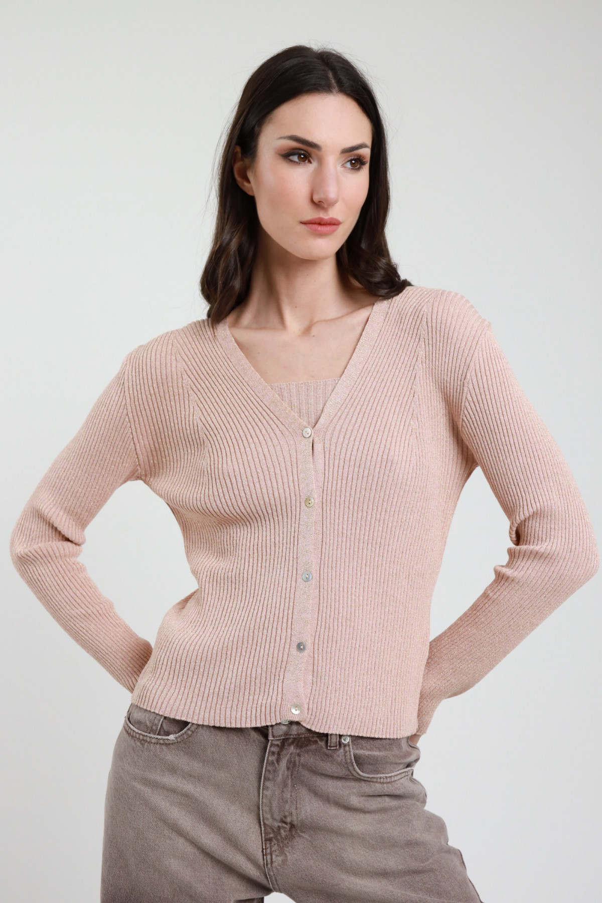 Cardigan a Costine in Lurex con Chiusura Bottoni.