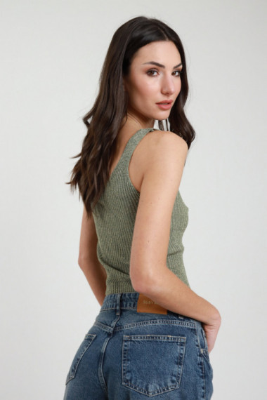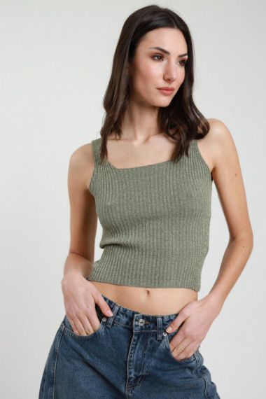 Top Crop a Costine in Lurex con Scollo Quadrato.