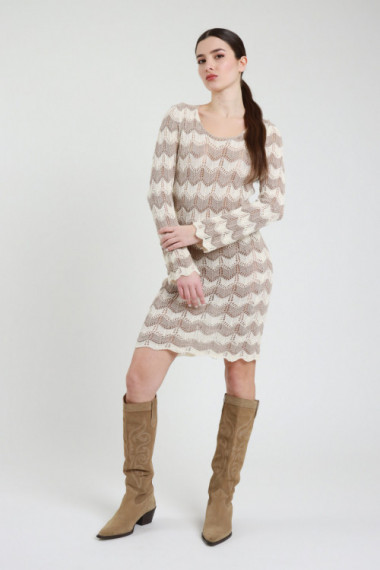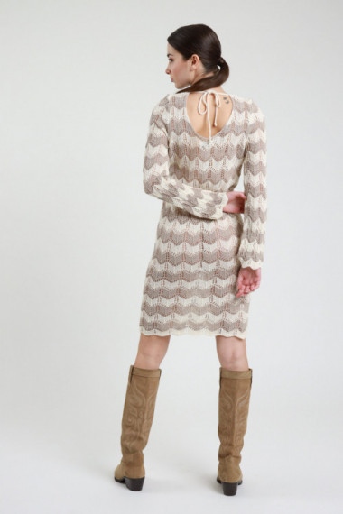 Abito Girocollo in Maglia Traforata con Trama Zig Zag, Maniche Lunghe Chiusura Lacci sul Retro.