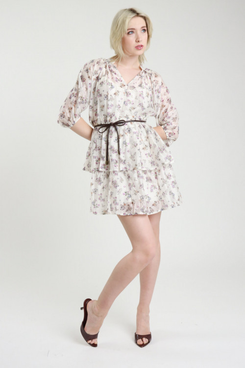 Mini Abito in Fantsasia Floreale con Maniche a 3/4 a Palloncino, Gonna a Balze ed Elastico in Vita con Cintura Rimovibile.
