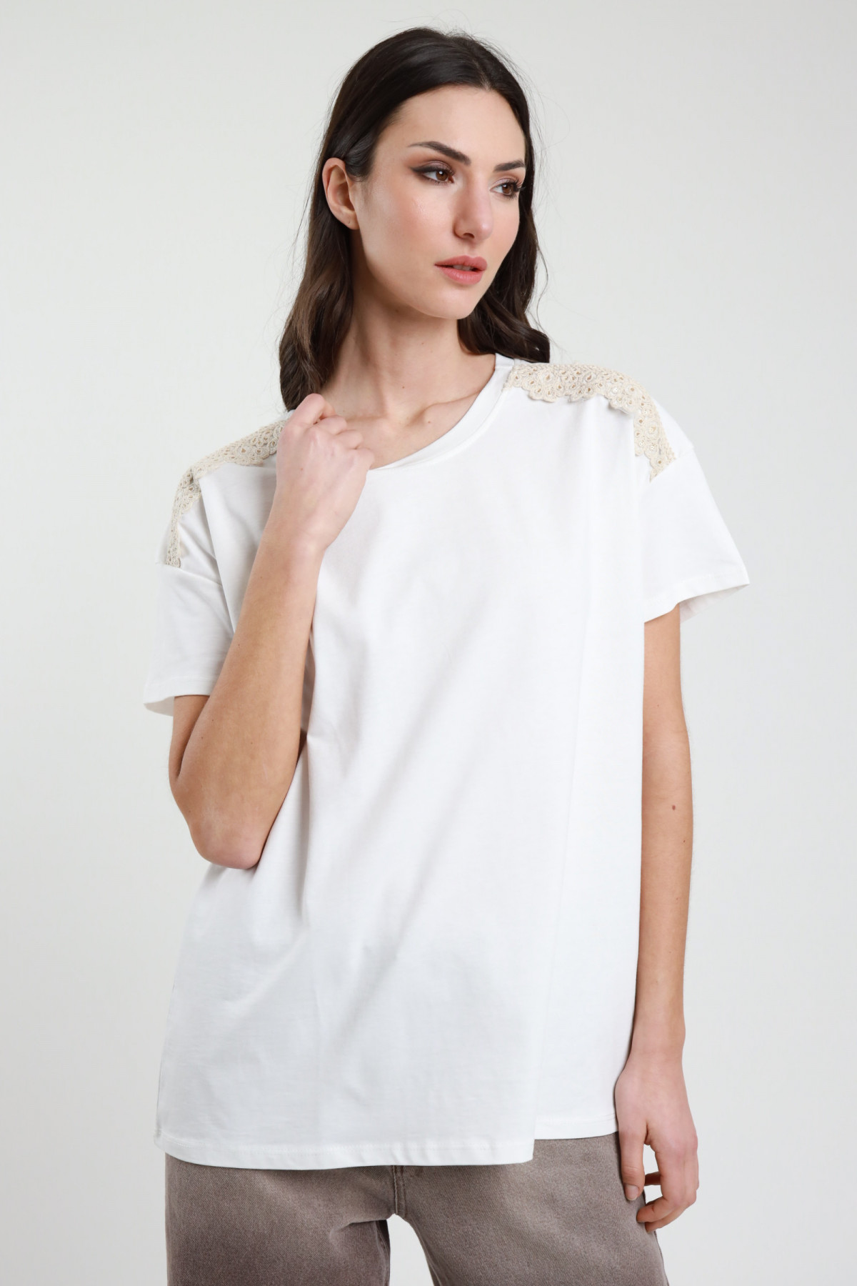 T-Shirt Mezze Maniche in Cotone con Dettaglio Macramè sulle Spalle.
