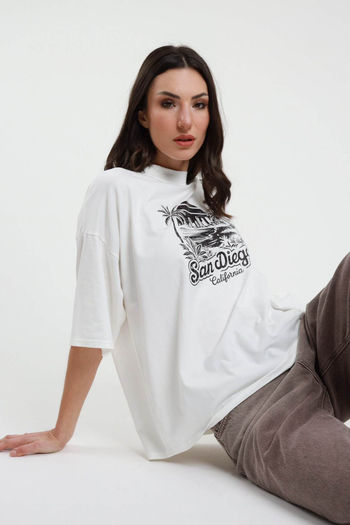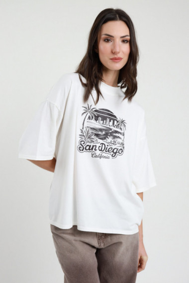 T-Shirt Over Mezze Maniche in Cotone Elasticizzato con Stampa Palme e Scritta "San Diego".