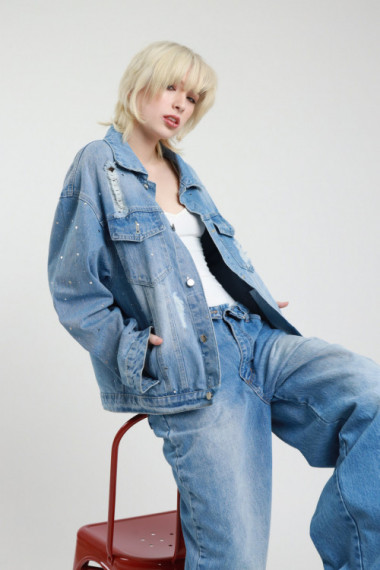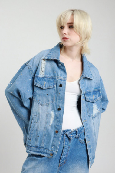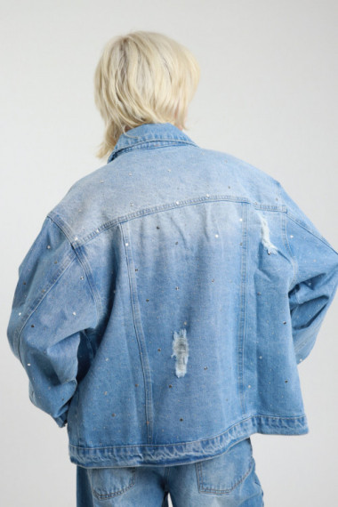 Giacca Over in Denim con Applicazione Borchie e Strass, Rotture e Sbiaditure.