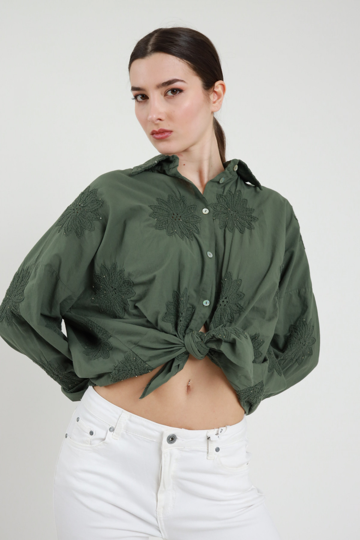 Camicia con Ricami e Micro Paillettes, Nodo sul Fronte Rimovibile.