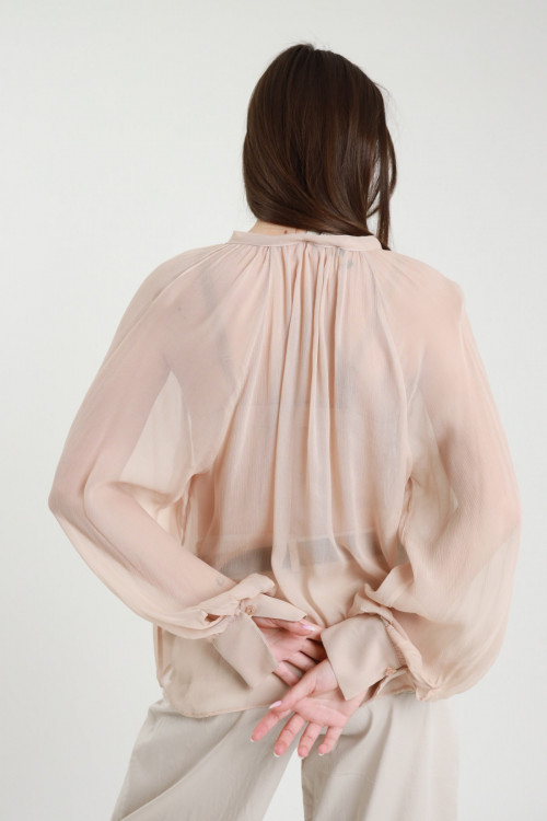 Camicia Semitrasparente in Georgette di Viscosa con Maniche a Sbuffo, Collo alla Coreana con Laccio.