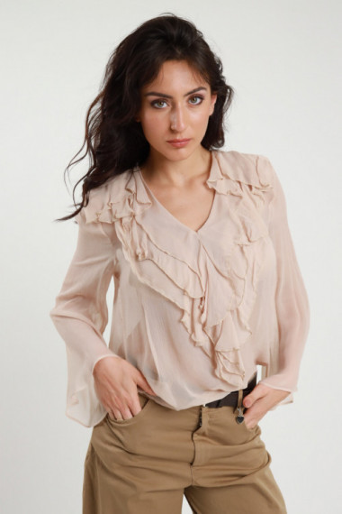 Blusa Semitrasparente con Rouches sul Fronte e Maniche Ampie.