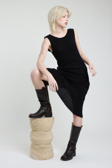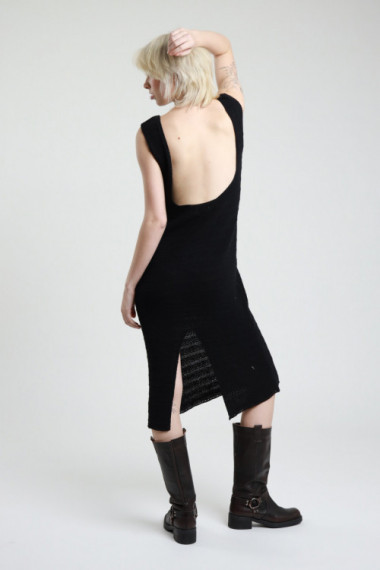 Abito Smanicato Midi in Maglia con Scollo Ampio sulla Schiena e Spacco in Fondo sul Retro.