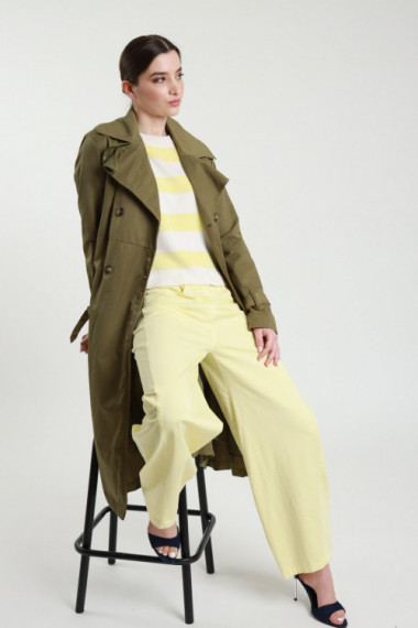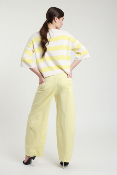 Palazzo Trousers With Pleats On The Front. Seamless waist, zip on the side, incorporated belt. 78%pl 18%vi 4%ea