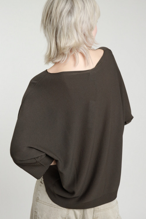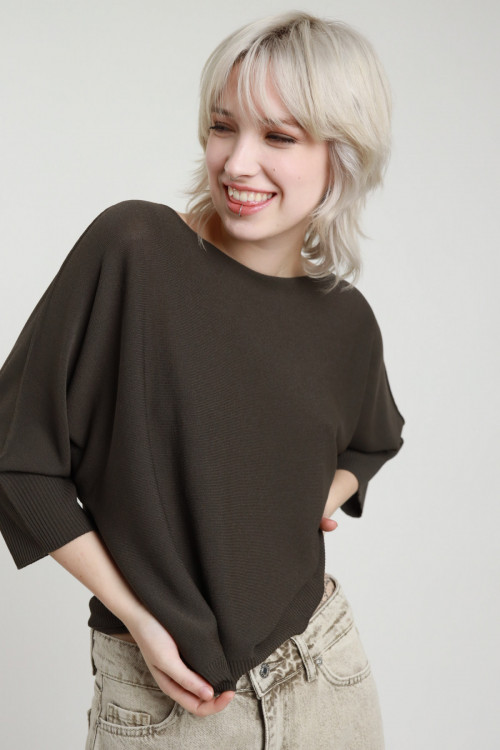 Maglia in Viscosa con Scollo a Barchetta, Maniche Raglan a 3/4, Effetto Slavato.