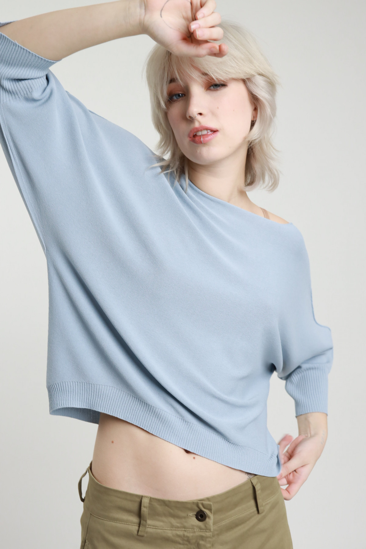 Maglia in Viscosa con Scollo a Barchetta, Maniche Raglan a 3/4, Effetto Slavato.