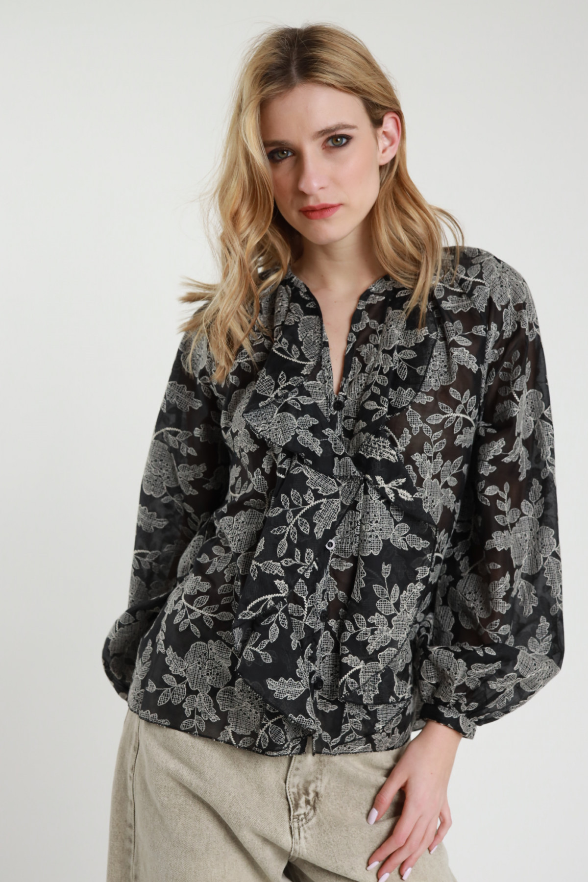 Camicia Semitrasparente con Ricami e Rouches sul Fronte.