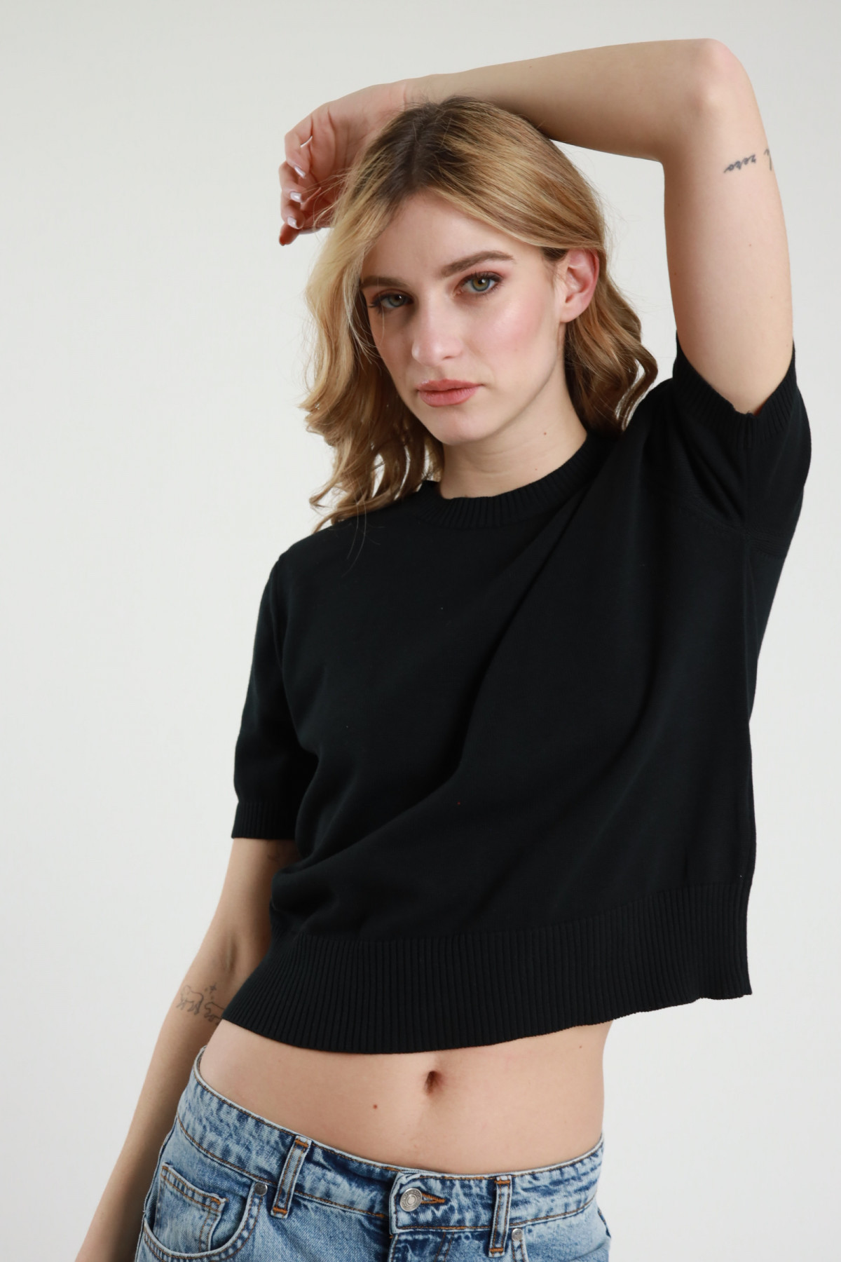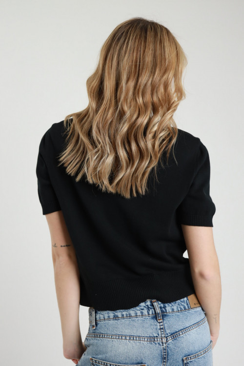Maglia Giorocollo Maniche Corte con Spalline Imbottite, Bordi a Costine.