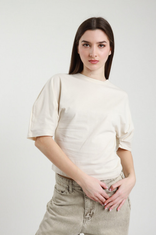 Maglia Girocollo in Cotone a Mezze Maniche, Stile Kimono con Riprese.