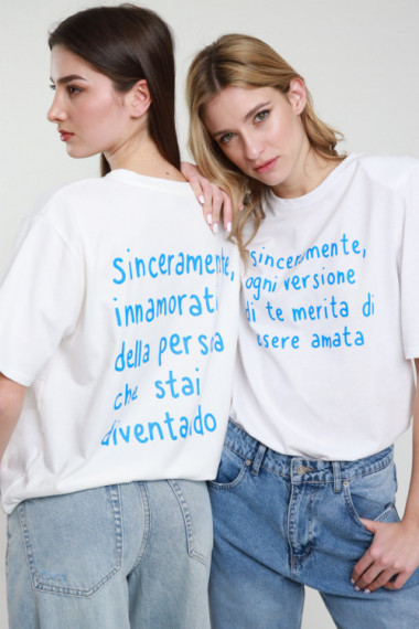 T-shirt limited edition in collaborazione con @Sinceramente, pagina Instagram di grande successo creata da Anna & Viola: due designer che, con semplicità e forza, portano in giro per le città messaggi legati alla salute mentale, trasformandoli in vere e proprie opere visive.