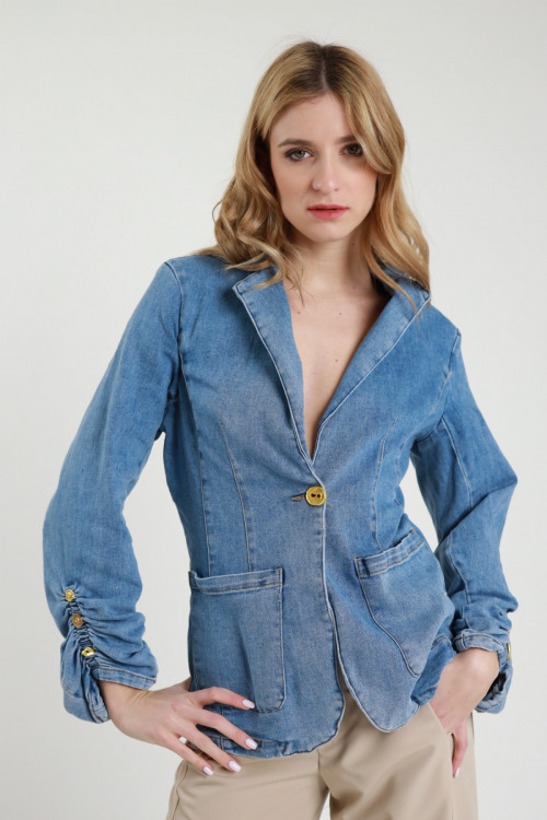 Blazer Monopetto in Denim con Tasche Applicate, Dettaglio Maniche Arricciate con Bottoni Gioiello Dorati.
