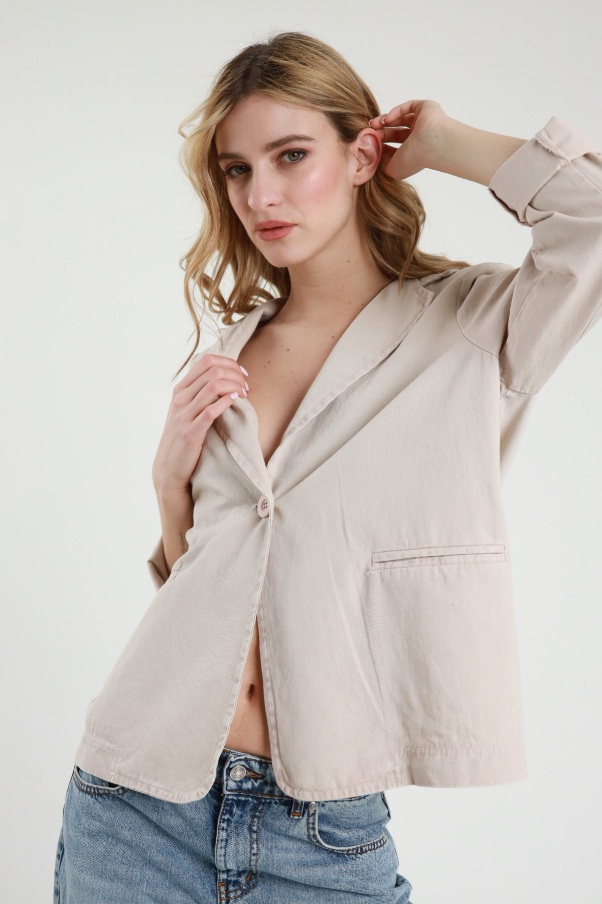 Blazer Monopetto in Cotone Tinto Marmorizzato, Tasche Filetto.