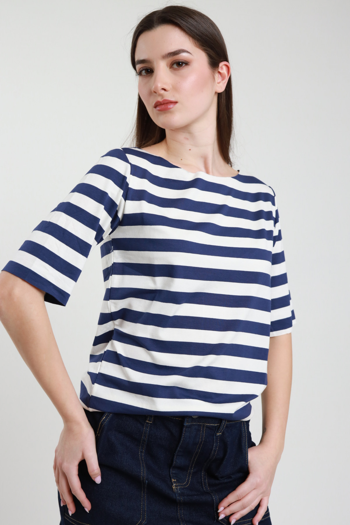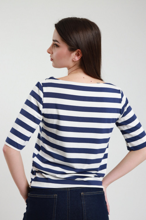 Maglia in Fantasia Righe, Girocollo, in Viscosa Elasticizzata con Mezze Maniche Lunghe.