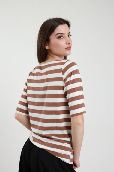 Maglia in Fantasia Righe, Girocollo, in Viscosa Elasticizzata con Mezze Maniche Lunghe.